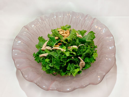 カリーノケール、リーフレタス、ナッツ、サラダチキンをお好きなドレッシングであえて、できあがり。